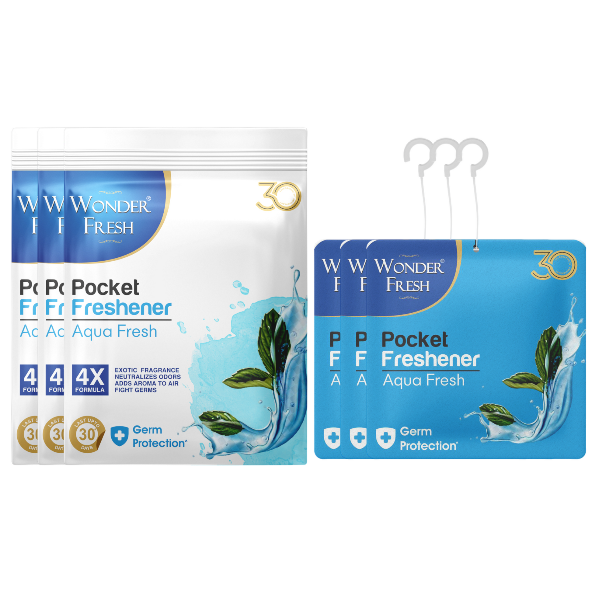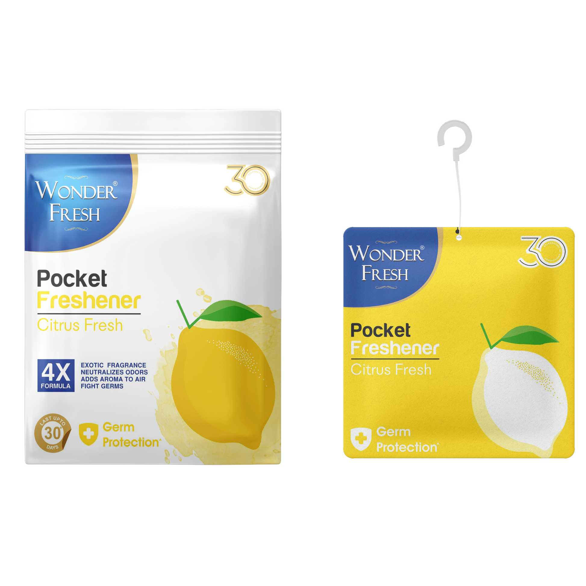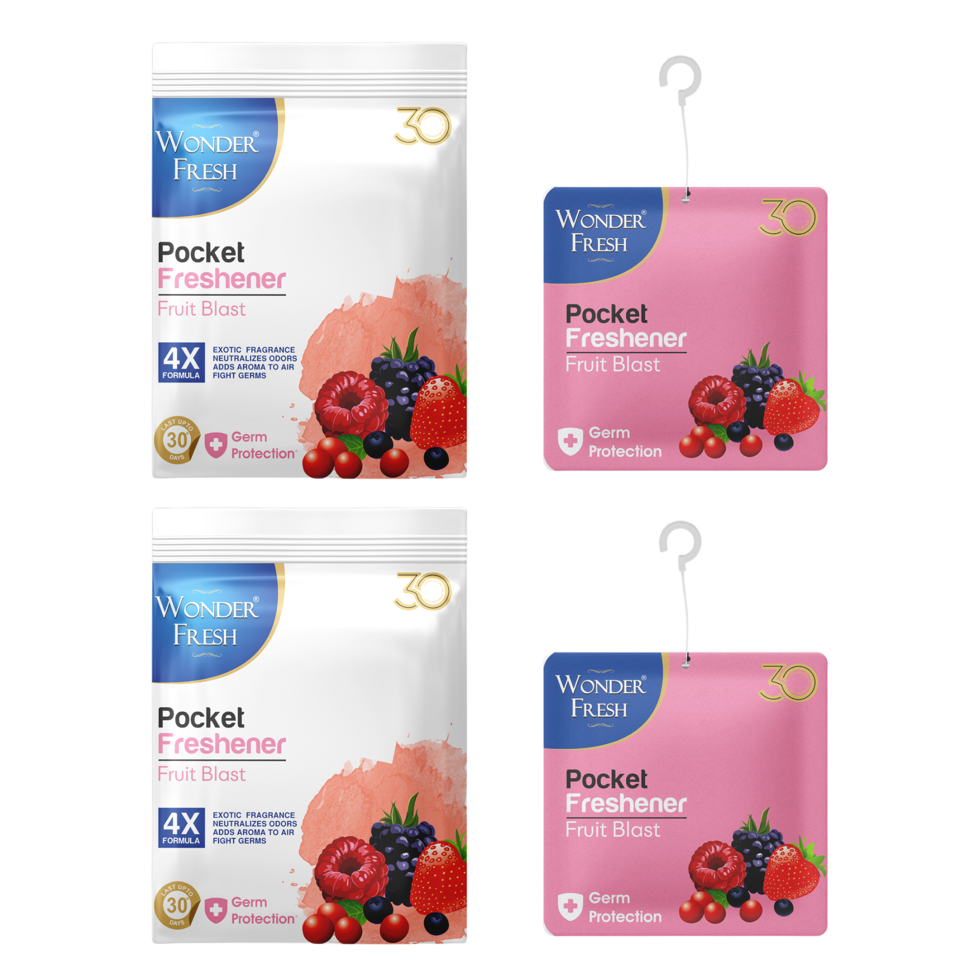 Wonder Fresh Air Power Pocket Hanging Freshener fills rooms, cars, and offices with long-lasting fragrances — Aqua Fresh, Citrus Fruit, Fruit Blast and Purple Majesty. Compact and easy to hang, each pocket neutralizes odors quickly and releases a pleasant scent for weeks, keeping bathrooms, wardrobes, vehicles and workspaces fresh, welcoming and odor-free. Perfect for daily use, travel or gifting; spill-free design requires minimal care and disperses aroma evenly. Lasts up to 3 weeks Avg.