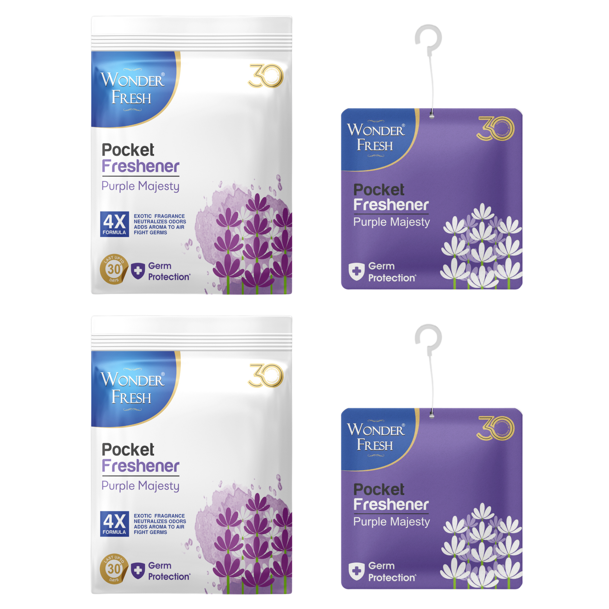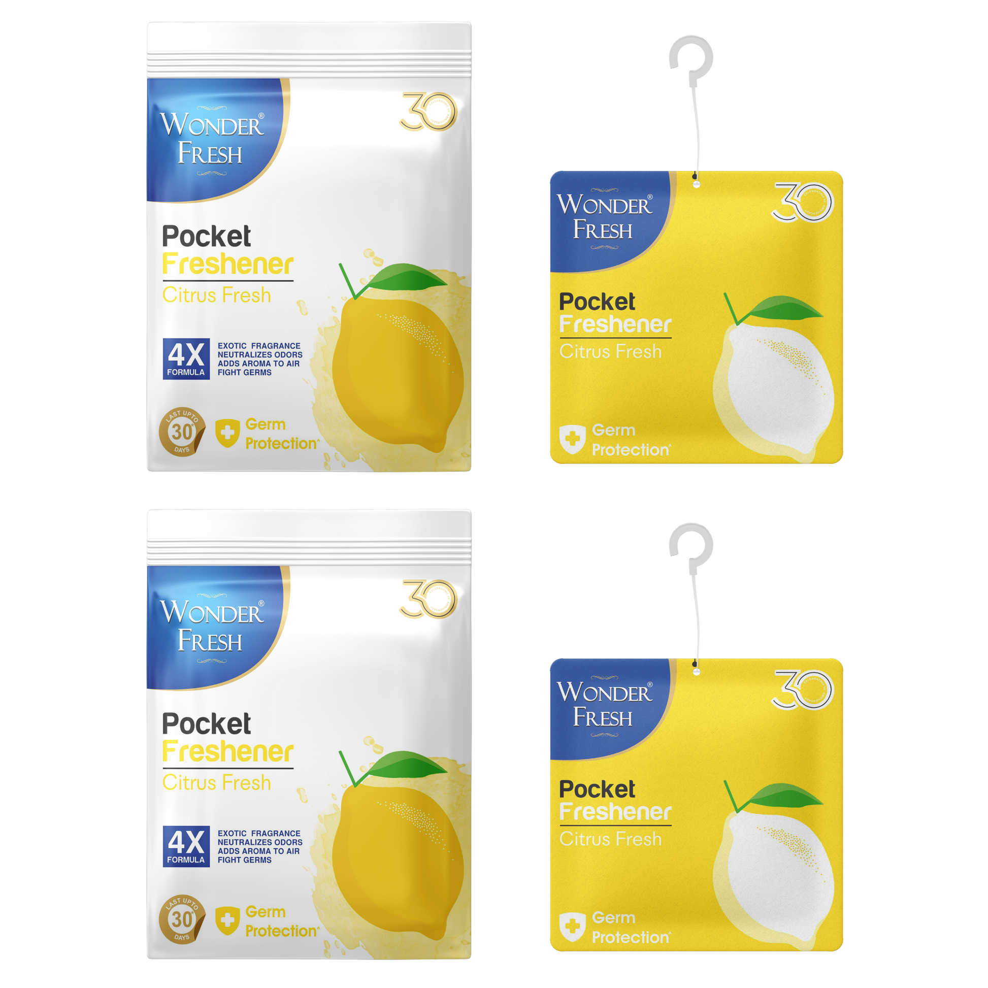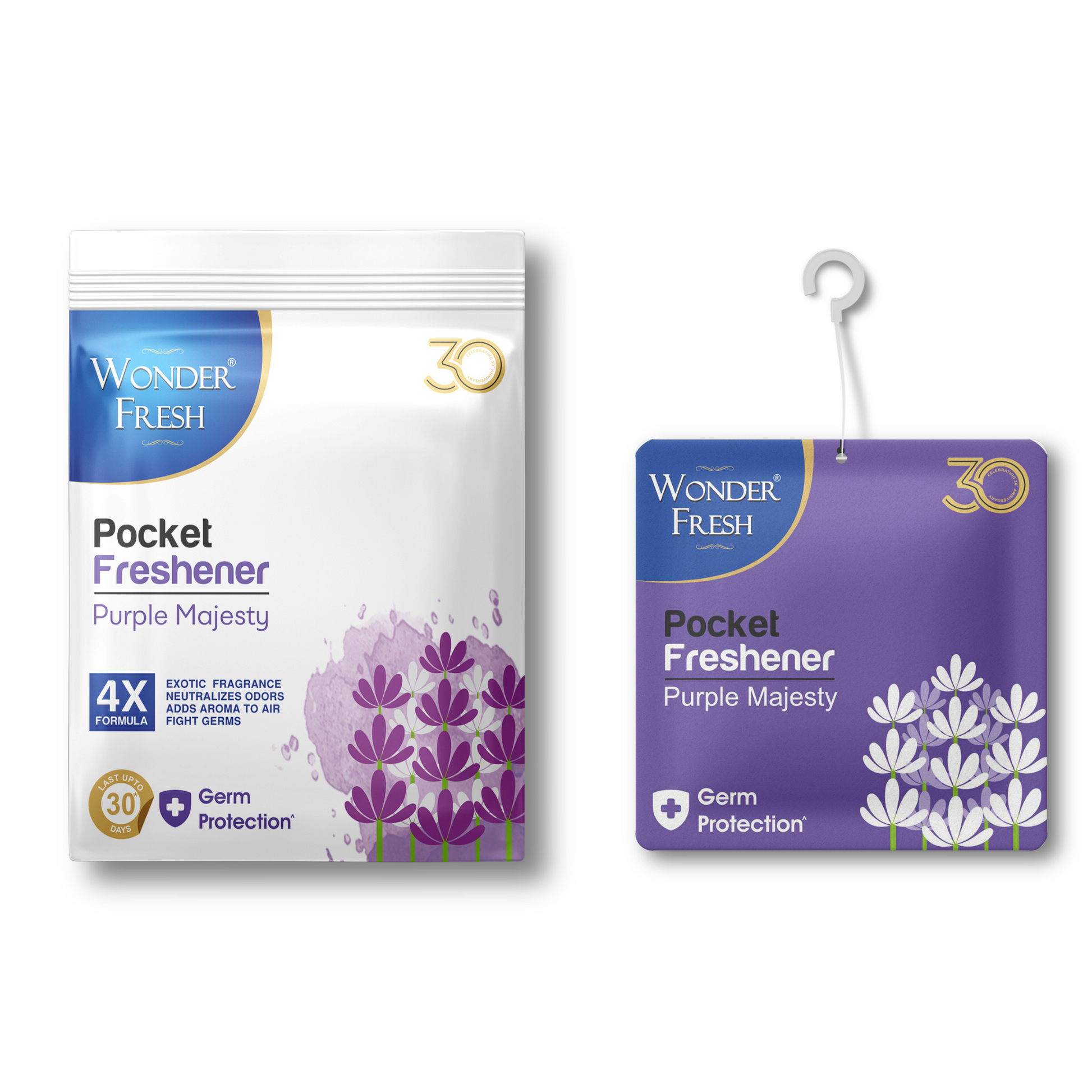 Wonder Fresh Air Power Pocket Hanging Freshener fills rooms, cars, and offices with long-lasting fragrances — Aqua Fresh, Citrus Fruit, Fruit Blast and Purple Majesty. Compact and easy to hang, each pocket neutralizes odors quickly and releases a pleasant scent for weeks, keeping bathrooms, wardrobes, vehicles and workspaces fresh, welcoming and odor-free. Perfect for daily use, travel or gifting; spill-free design requires minimal care and disperses aroma evenly. Lasts up to 3 weeks Avg.